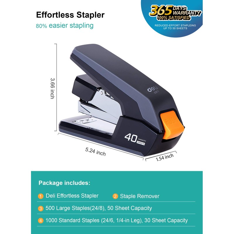 Deli Effortless Desktop Stapler, 40 Sheet Capacity, One Finger Touch Stapling, Easy to Load Ergonomic Heavy Duty Stapler, Includes 1500 Staples and Staple Remover