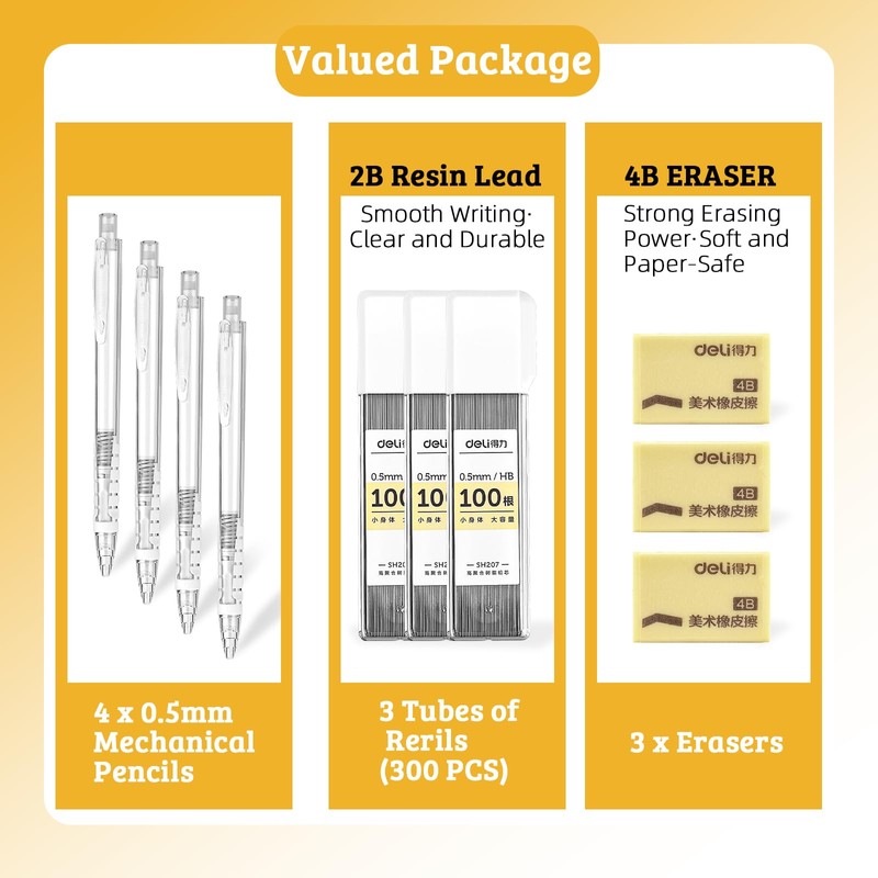 deli Mechanical Pencil Set, 0.5mm 4 PCS Drafting Mechanical Pencils with 300 HB Leads & 3 Erasers, School Supplies for Art, Drafting, Writing, Students