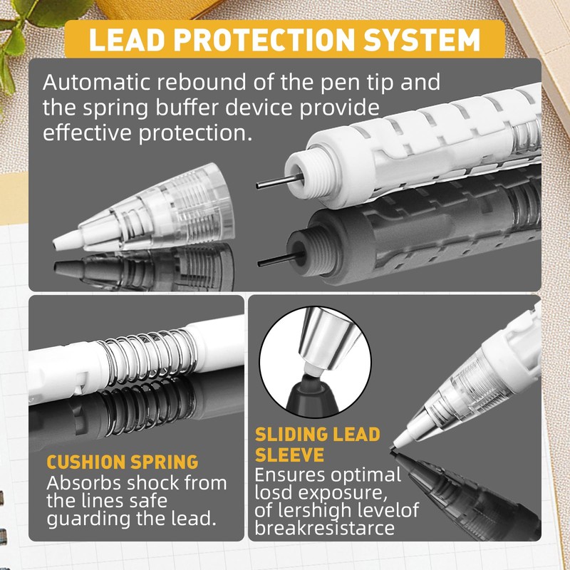 - Unique Design: Lead-gripping mechanism and damped tube design prevent lead breakage. The auto-retractable tip protects the lead, while a secure clip prevents desk slippage