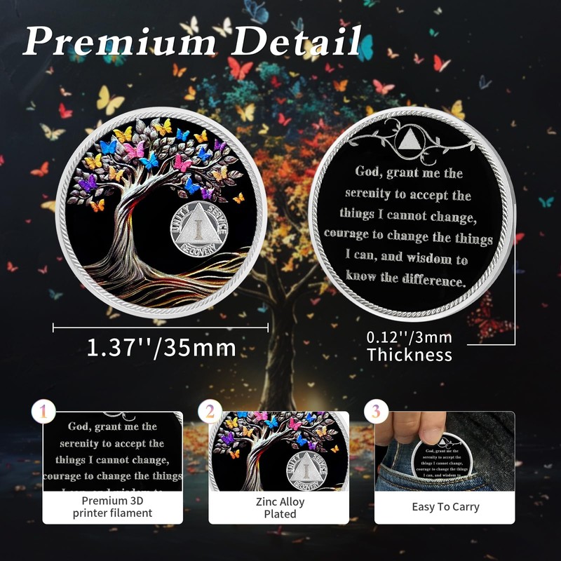 - 🌲Living Clean Journey: The one year sobriety coin, meticulously crafted with unique 3D artistry, makes for an ideal token to celebrate the successful journey to sobriety over the past year. The colorful butterflies circling the tree of life on the AA coin symbolize rebirth and transformation, representing the journey from pain and adversity to reclaiming freedom and hope for those in recovery. Cute Recovery Butterflys inspire us to embrace the journey of change with positivity.