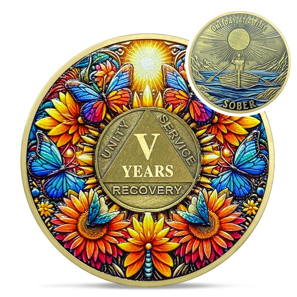 - 🌻Living Clean Journey: The 5 year sobriety coin, meticulously crafted with unique 3D artistry, makes for an ideal token to celebrate the successful journey to sobriety over the 5 year. The swirling colorful butterflies dancing around the sunflower on the sober token symbolize rebirth and transformation, representing the journey of recovering individuals reclaiming freedom and hope from pain and adversity. Vibrant sunflower inspires us to embrace change, reaching towards sun and clean.