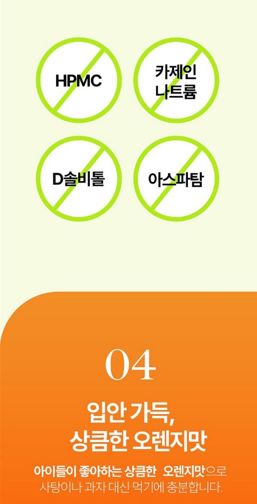 - 원(재)료명 및 함량: 비타민C, 비타민E혼합제제(DL -a-토코페릴아세테이트, 포도당시럽분말, 변성 전분, 이산화규소), 니코틴산아미드 푸마르산제 일철, 판토텐산칼슘, 비타민B2혼합제제(비타민 B2, 말토덱스트린, 구연산삼나트륨, 구연산), 산 화아연, 황산망간, 비타민A 혼합제제(비타민A 산염 포도당시럽분말, 옥수수전분, 아라비아검, 비타민E), 비오틴혼합제제(비오틴 제이인산칼 슘), 아셀렌산나트륨혼합제제(아셀렌산나트륨, 제이인산칼슘), 황산동, 비타민D3혼합제제(비타 민D, 아라비아검, 설탕, 옥수수전분, 중쇄중성지 방, 이산화규소, 비타민E), 비타민B6염산염, 비타 민B1염산염, 비타민B2, 비타민K 혼합제제(비타 민K 아라비아검, 자당), 엽산, 정제포도당, 탈지 분유, 결정과당, 자일리톨, 천연오렌지향분말(친 연향료), 이산화규소, 스테아린산마그네슘, 수크 랄로스(감미료), 효소처리스테비아, 레드코멘C 분말, 마이크로바이옴시너지복합분말, 소엽추 출몰 우유, 대두 함유