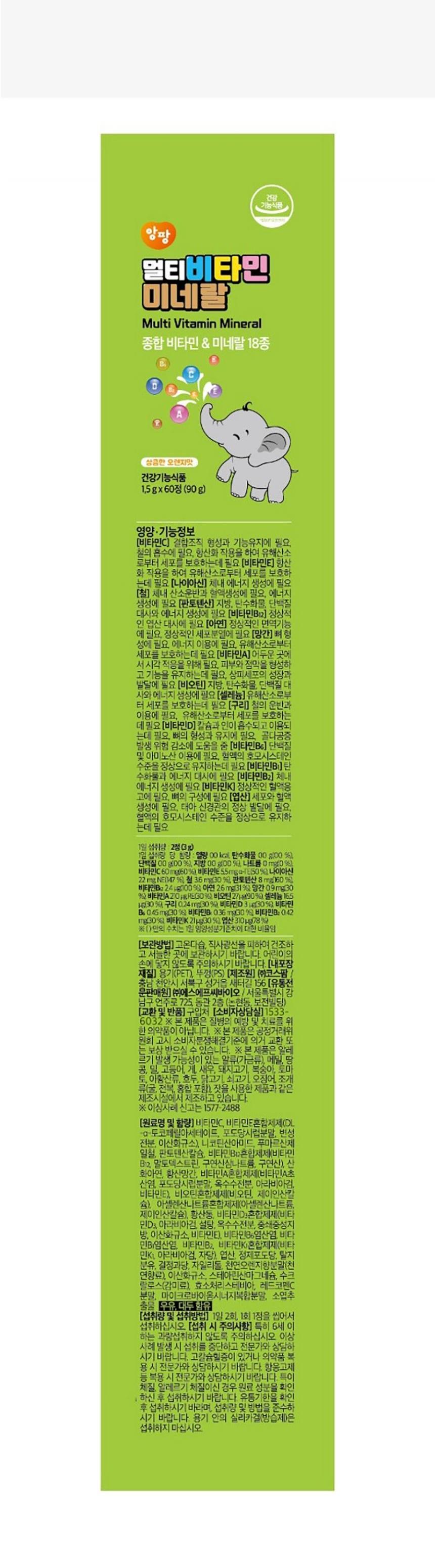- 기능정보: 영양·기능정보 [비타민C] 결합조직 형성과 기능유지에 필요 철의 흡수에 필요, 항산화 작용을 하여 유해산소 로부터 세포를 보호하는데 필요 [비타민E] 항산 화 작용을 하여 유하산소로부터 세포를 보호하 는데 필요 [나이아신] 체내 에너지 생성에 필요 [철] 체내 산소운반과 혈액생성에 필요, 에너지 생성에 필요 [판토텐산] 지방, 탄수화물, 단백질 대사와 에너지 생성에 필요 [비타민B12] 정상적 인 엽산 대사에 필요 [아연] 정상적인 면역기능 에 필요, 정상적인 세포분열에 필요 [망간] 최형 성에 필요 에너지 이용에 필요 유해산소로부터 세포를 보호하는데 필요 [비타민A] 어두운 곳에 서시각 적응을 위해 필요 피부와 점막을 형성하 고 기능을 유지하는데 필요, 상피세포의 성장과 발달에 필요 [비오틴] 지방, 탄수화물, 단백질 대 사와 에너지 생성에 필요 [셀레늄] 유해산소로부 터 세포를 보호하는데 필요 [구리] 철의 운반과 이용에 필요, 유해산소로부터 세포를 보호하는 데필요 [비타민D] 칼슘과 인이 흡수되고 이용되 는데 필요, 뼈의 형성과 유지에 필요, 골다공증 발생 위험 감소에 도움을 줌 [비타민Bo] 단백질 및 아미노산 이용에 필요, 혈액의 호모시스테인 수준을 정상으로 유지하는데 필요 [비타민B1] 탄 수화물과 에너지 대사에 필요 [비타민B2] 체내 에너지 생성에 필요 [비타민K] 정상적인 혈액응 고에 필요, 뼈의 구성에 필요 [엽산] 세포와 혈액 생성에 필요, 태아 신경관의 정상 발달에 필요 혈액의 호모시스테인 수준을 정상으로 유지하 는데 필요