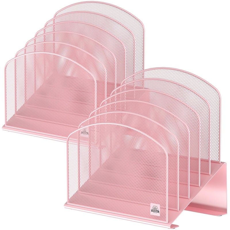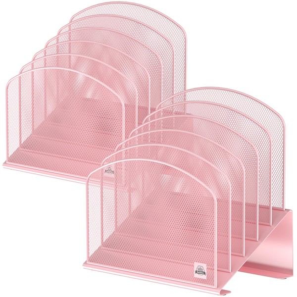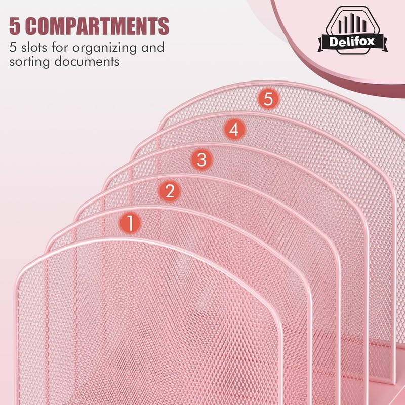 Delifox Inclined Desk File Organizer, 5-Section Vertical File Folder Holder Stand Metal Rack File Sorter for Office Classroom Desktop Organization (Pink, 2Pack)