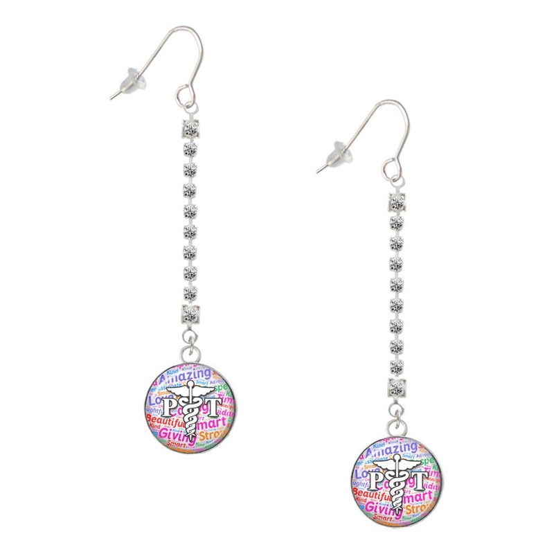 Glass Dome Multi Color PT - Physical Therapist - Silver-tone Long Sparkle Dangle French Earrings. Glass Dome Multi Color PT is approx: 0.9 x 0.7 x 0.2 inches (HxWxD) including loop. High quality printed paper sealed under a glass dome in a metal frame. Elegant rhinestone chain is approx. 1.5 inches long with steel french hook wire. These earrings come with a small rubber earnut to help keep earrings from falling off. These long dangle earrings add sparkle to your fashion. Wear these to parties, birthdays, celebrations, and anytime you need to shine. PLEASE NOTE: Our products are not intended for individuals 14 years and younger.
