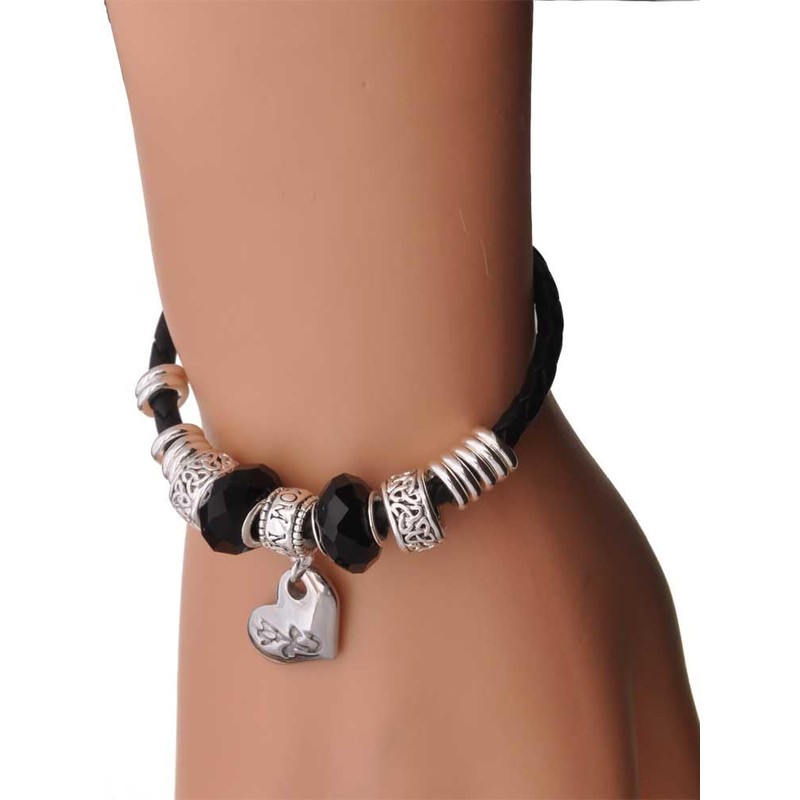 - Silvertone Celtic Knot beads with faceted glass and spacer beads braided leather bracelet. 4mm Black Braided Leather is made in the U.S.A.