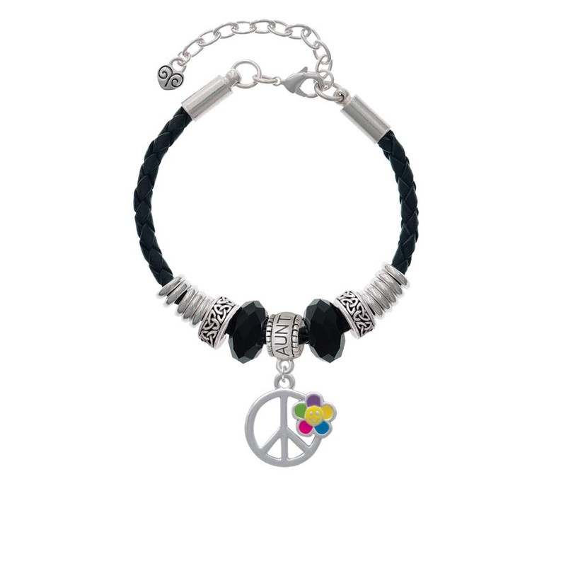 - Silvertone Large Multicolored Daisy on Peace Sign - Aunt Celtic Knot Leather Bead Bracelet, 7"+2" Extender.