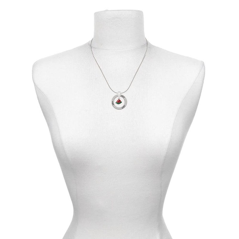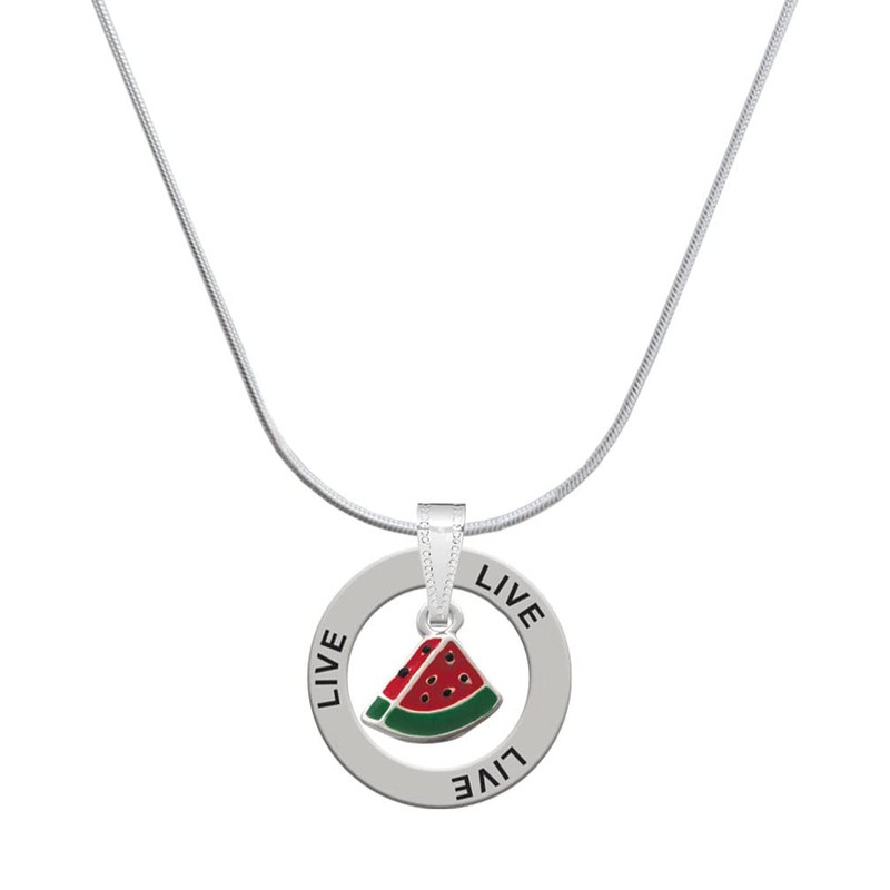 Silvertone Mini Enamel Watermelon - Piece - Live Ring Charm Necklace, 18". Charm size is approx. 0.55 x 0.46 x 0.05 inches (HxWxD) including loop. Silvertone snake chain necklace is 18 inches with a lobster claw clasp. Affirmation ring is 7/8" in diameter. Words to live by. Wear this necklace as reminder to live your life. Live it on your terms. PLEASE NOTE: Our products are not intended for individuals 14 years and younger.