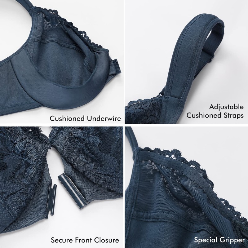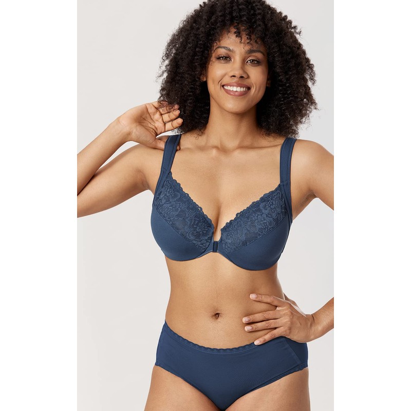 DELIMIRA Women's Front Closure Bra with Underwire Bras Large Breasts Strong Hold Soft Lace U-Back Unlined, Sargasso, 110D