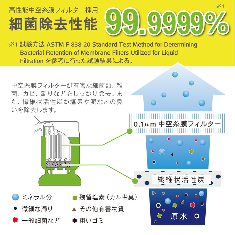 - Made in Japan: 99.999% bacteria removal rate. Adopts a hollow filament filter to remove harmful bacteria, bacteria, mold, and turbidity. The fiber activated carbon also removes chlorine and mud odors. Manufactured at a factory in Nagano Prefecture, and carefully inspected one by one