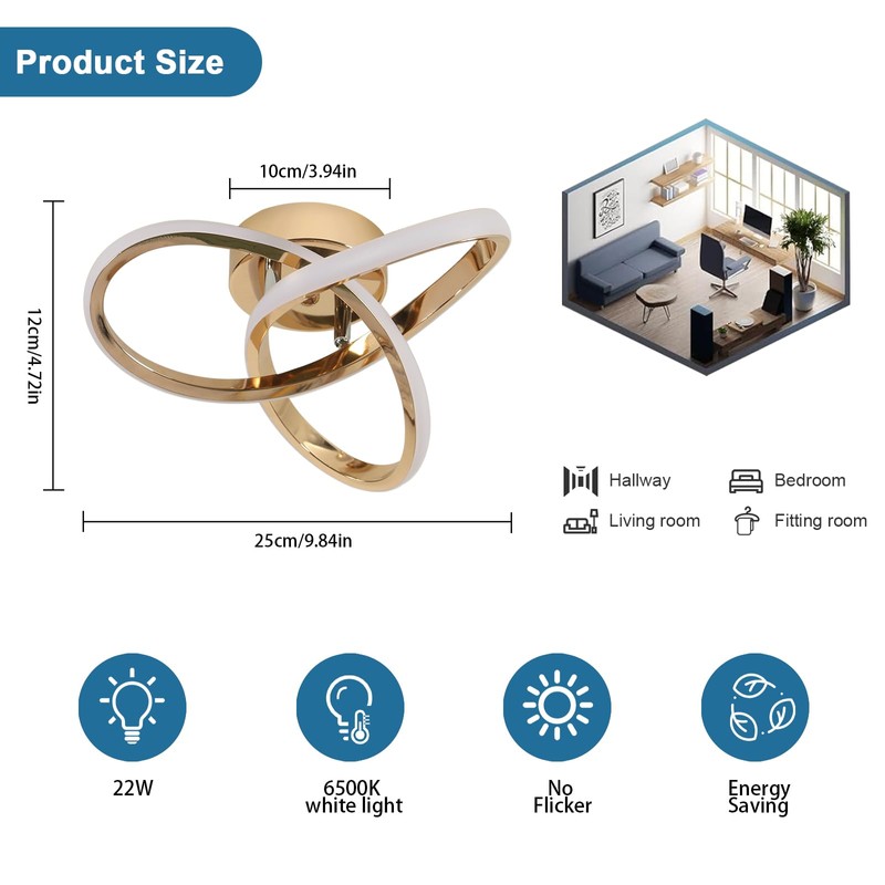 - Specifications of the modern ceiling light: size: 25 x 25 x 12 cm. Power: 22W. Luminous flux: 2500LM Colour temperature: 6500K cool white light (not dimmable). Voltage: AC 220-240V. Lighting area: 10-15 square metres. Material: metal, silicone. The surface of the lamp body is plated, fine texture, anti-corrosion, durable