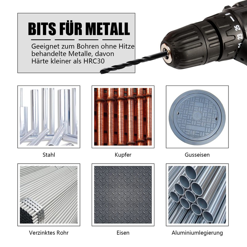 1. Made of M35 high speed steel and contains 5% cobalt, which increases wear resistance, durability and extra longer service life. Fully ground spiral groove design clears particles quickly, reduces friction and heat for faster drilling performance. 3.135° quick-cut pilot gap points are self-centring and can penetrate quickly with less pressure. Straight shank prevents walking and makes drilling more precise and faster. Suitable for drill holes such as steel, copper, cast iron, galvanised pipe, aluminium alloy, wood and other softer metals. If you drill stainless steel, please lower the drilling speed. This drill fits the majority of the drill currently on the market and easy storage and DIY. What is M35 cobalt? The addition of 5% cobalt increases the heat and wear resistance of the drill, making it perfect for stainless steel and cast iron. M35 cobalt steel drill bits can penetrate a 5 mm thick 304 stainless steel plate in a few seconds. br>Instuctions for use: