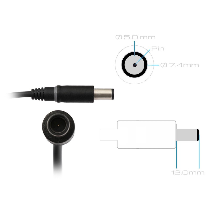 - Plug type: round, connector shape: 180° straight, outer diameter of the connector: 7.4 mm, inner diameter of the connector: 5.0 mm, length of the connector: 12.0 mm, pin in the connector: yes, length of the connection cable from the power supply to the notebook: approx. 1.75 m