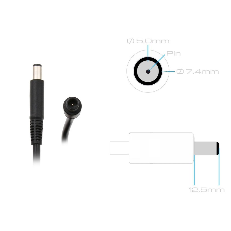 • Plug type: round, connector shape: 180° straight, outer diameter of the connector: 7.4 mm, inner diameter of the connector: 5.0 mm, length of the connector: 12.5 mm, pin in the connector: yes, length of the connection cable from the power supply to the notebook: approx. 1.75 m