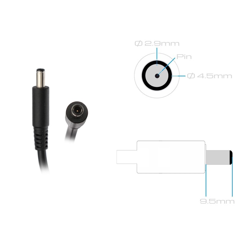 - Plug type: round, connector shape: 180° straight, outer diameter of the connector: 4.5 mm, inner diameter of the connector: 2.9 mm, length of the connector: 9.5 mm, pin in the connector: yes, length of the connection cable from the power supply to the notebook: approx. 1.75 m