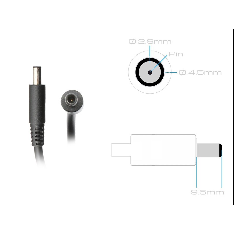 • Plug type: round, connector shape: 180° straight, outer diameter of the connector: 4.5 mm, inner diameter of the connector: 2.9 mm, length of the connector: 9.5 mm, pin in the connector: yes, length of the connection cable from the power supply to the notebook: approx. 1.75 m