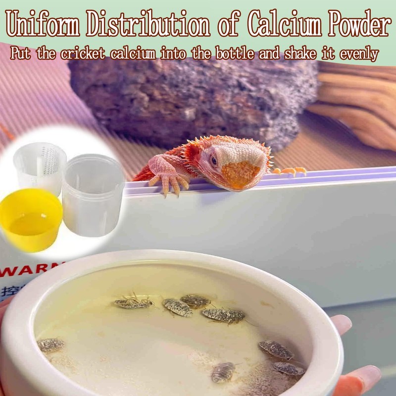 - Easy to operate and use, simply add a small amount of calcium powder to the shaker bottle, add crickets or insects and shake gently.