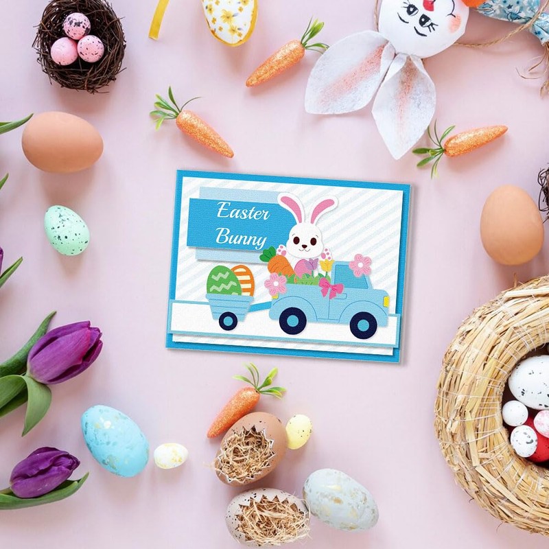 DELORIGIN Cutting Dies with Easter Bunny Car Card Making Stencil Metal Rabbit Carrots Car Cutting Scrapbooking Embossing Stencils Frame Cutting Dies Novelties for Album Invitation Decoration