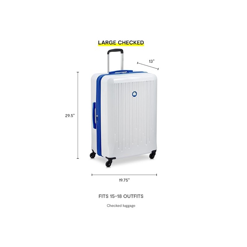 - STYLISH AND FUNCTIONAL: The Delsey Paris Christine collection marries function and fashion with its glossy white exterior, expandable zipper, and pops of color trim and details. This luggage is lightweight and made from ABS and polycarbonate to ensure it stays intact while traveling. The dimensions of this fashionable large check-in are 28"x25"20", and you can nest your other luggage within this large one for easy storage.