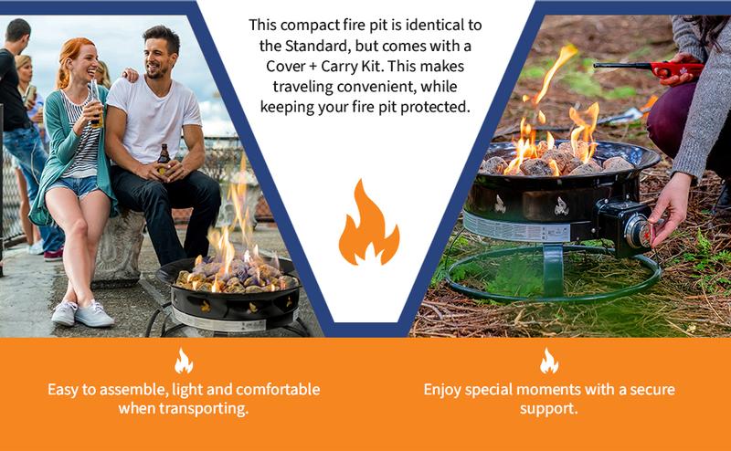 - COMPLETE FIRE PIT KIT: Includes Cover & Carry Kit, pre-attached 10-Ft hose to keep your standard 20-Lb propane tank cylinder (not included) safely out of sight, fully adjustable regulator with chrome valve knob for varying flame height, and 4.4-Lb natural lava rock set designed to enhance flickering effect. Optional accessories of CSA approved Natural Gas Conversion Kit 780 and Standard Carry Bag 760 available separately.