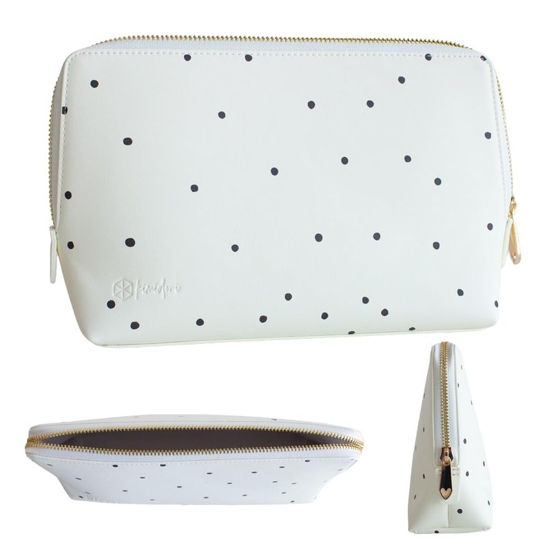 Deluxe Vegan Leather Toiletry Bag 26 x 16 cm Makeup Organizer Case with Gold Zipper. Also useful as Travel Toiletry Bag, Makeup Bag and/or Travel Bag, Small Pencil Case, black dots, scrapbooking
