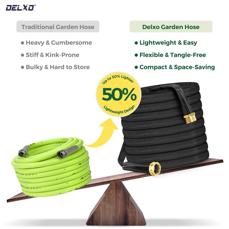 The Delxo garden hose 100 ft is designed with flexibility, durability, and convenience in mind. Whether you're maintaining your garden or cleaning your car, this lightweight water hose delivers reliable performance and compact storage.