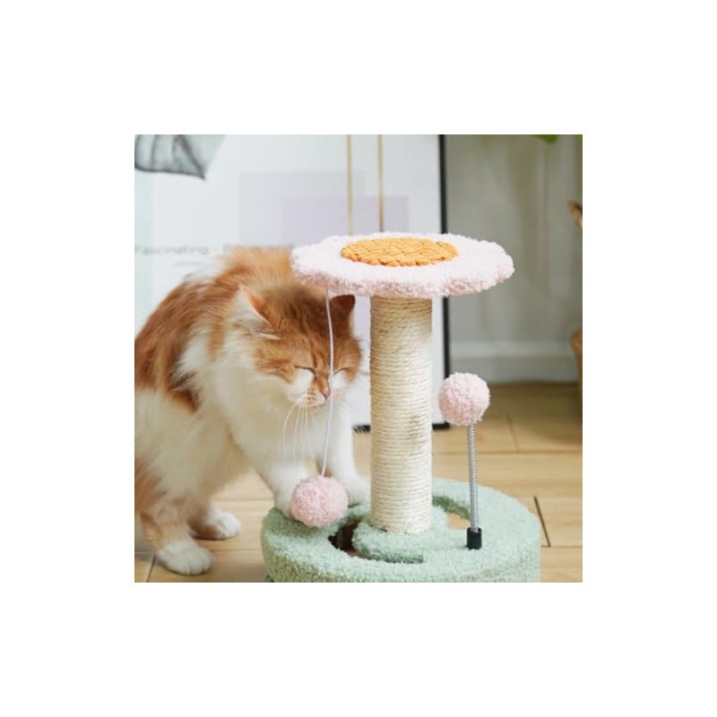 Demaciya Cat Tree Scratching Post, Flower Design with Plush Platform, Mint Green Base with Pom Pom Toys