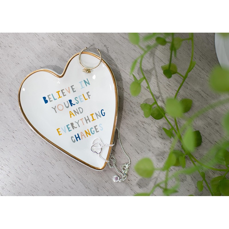 - Features sentiment reading "Believe in yourself and everything changes"; Meant to hold small treasures, trinkets, and keepsakes
