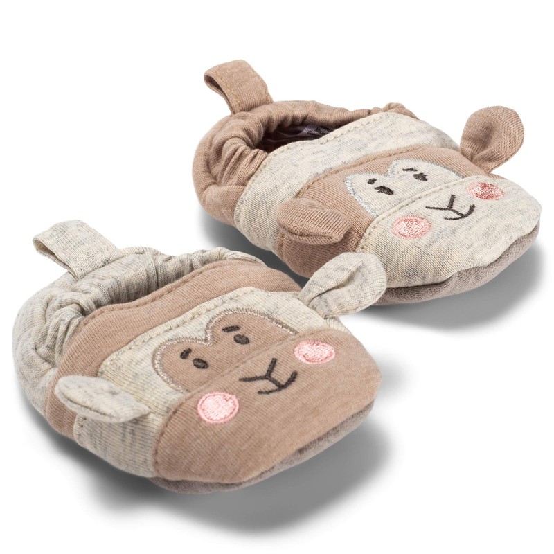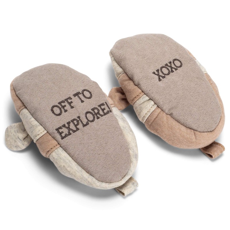 • Soft, jersey-knit Monkey booties look adorable, feel great, and match neutral and animal themed clothes; Sentiment on soles read "Off to explore" and "XOXO"
