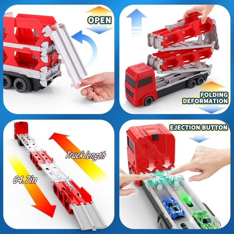 - 【7 in 1 Transport Vehicle Toy】: A secure latch in the back opens and pulls out to create a 61-inch race track length, which is great for 1 or 2 players to race game. Just press a button and the launcher will automatically push the die-cast cars onto the track. Compete with your partner to see whose car is running faster!