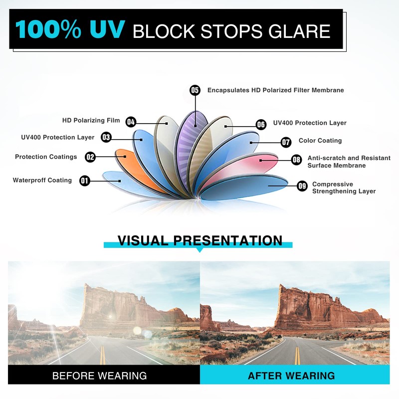 - POLARIZED SUNGLASSES FOR MEN AND Women- HD Polarized Technology Lens can Effectively Reduce Reflection and Eliminate Glare from the Road, and Scaly Light on the Glass Surface, Improve Contrast and Visual Clarity, Allow for True Perception of Colors, Improve Visual Comfort and Effectively Reduce Eye Strain. Suitable for all Outdoor Activities, Driving, Fishing or any Water Sports to Wear