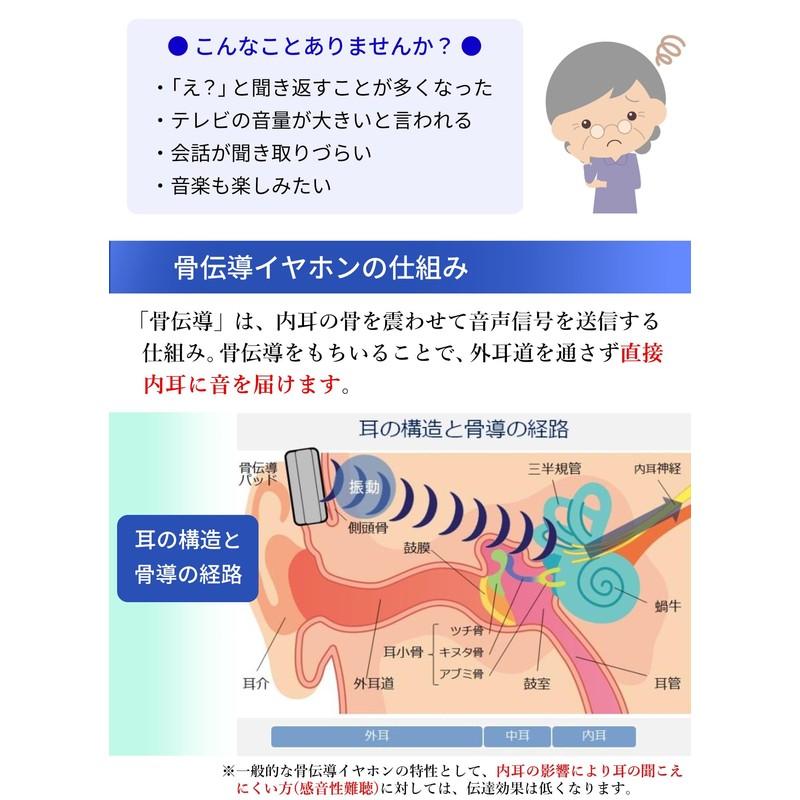 一般的な骨伝導イヤホンの特性上、内耳の影響によりお耳が聞こえにくい方に対しては伝達がされ難い場合がございます。