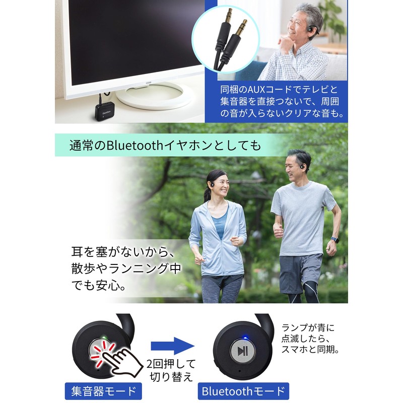 - 【会話が楽に】集音器によって会話の音声を集音し届けます。耳が聞こえにくい方や、会話相手と距離が開いてしまっても、大声を出さず会話がスムーズに行えます。※一般的な骨伝導イヤホンの特性上、内耳の影響によりお耳が聞こえにくい方に対しては伝達がされ難い場合がございます。