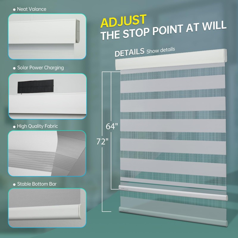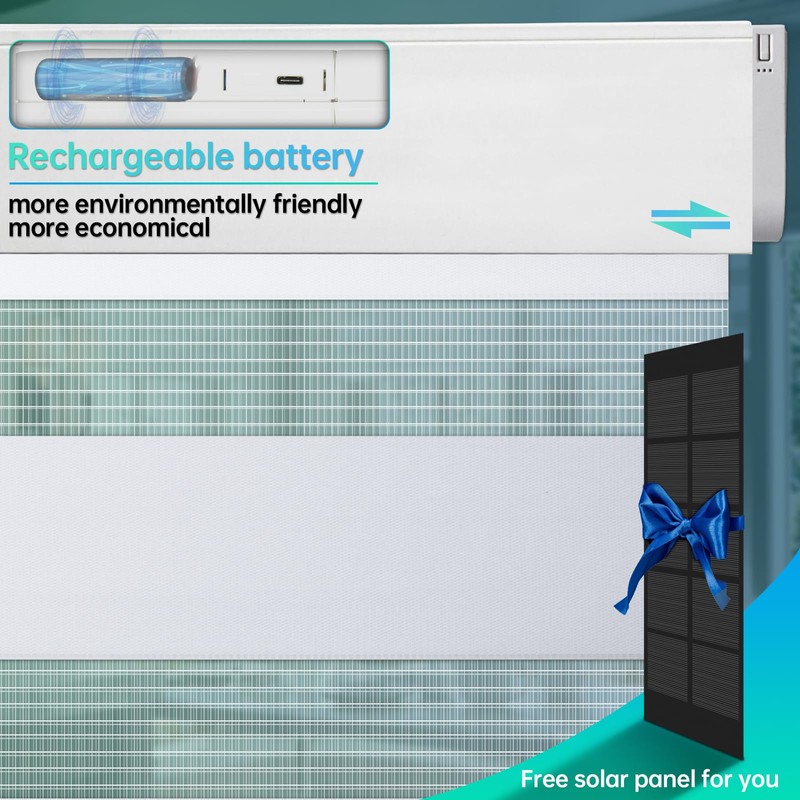 - ENVIRONMENTAL AND COST SAVING: Our motorized zebra blinds are not only convenient,but motorized blinds are also environmentally friendly. Solar powered motorized zebra blinds are charged automatically during the day, eliminating the need for batteries or frequent charging, saving money and reducing their carbon footprint. Join us and contribute to the eco-friendly home without sacrificing fashion. Our motorized blinds have a stylish and modern design that adds a touch of elegance to any room .