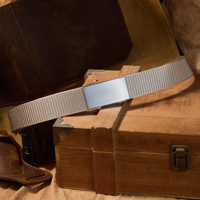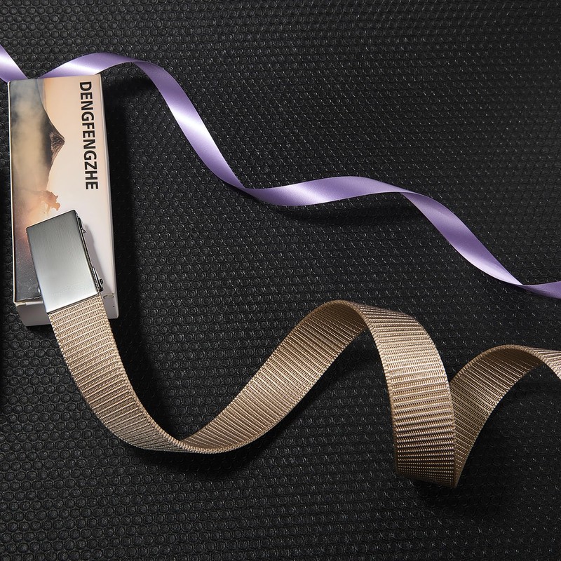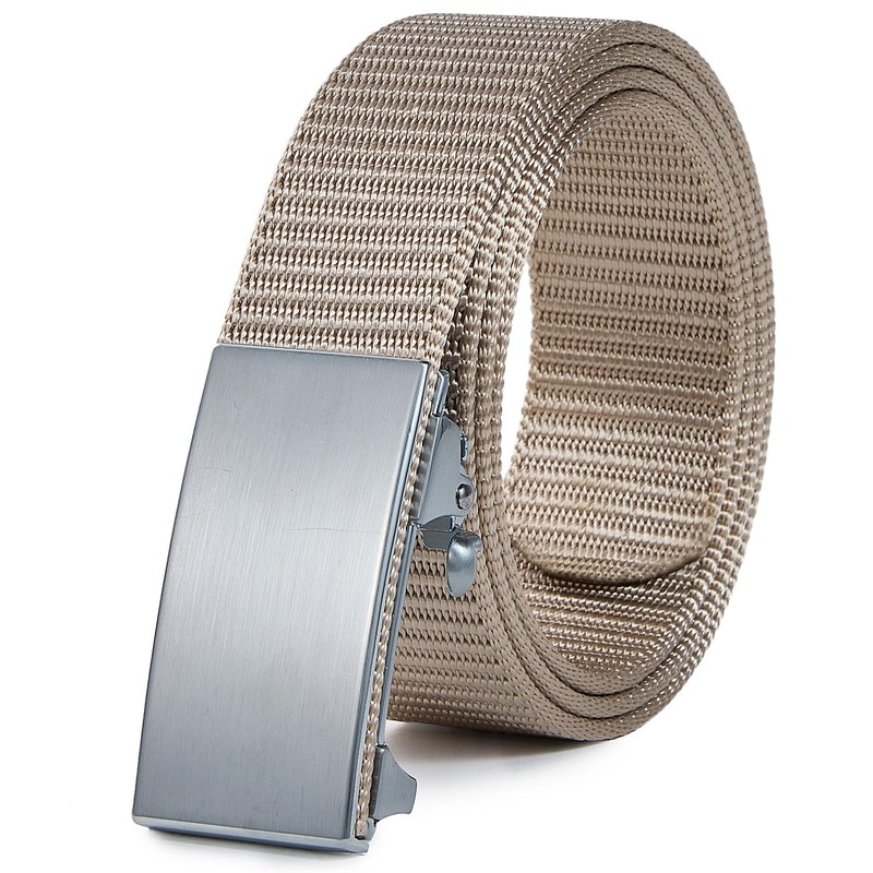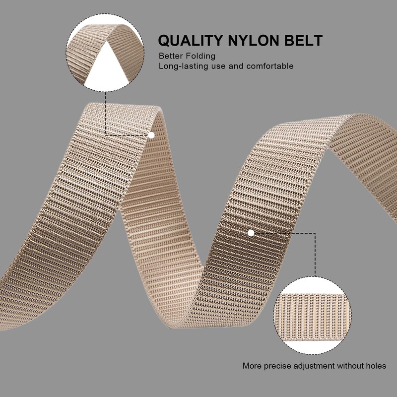 - NO HOLES ADJUSTABLE BELT: Solid nylon strap, width 1.4", thickness 3.5mm. This casual men belt made of stretchable nylon strap, with automatic buckle, easy to adjust different waist sizes. We do not recommend using tools to shorten the length of the belt, please refer to the size chart to choose the appropriate length.