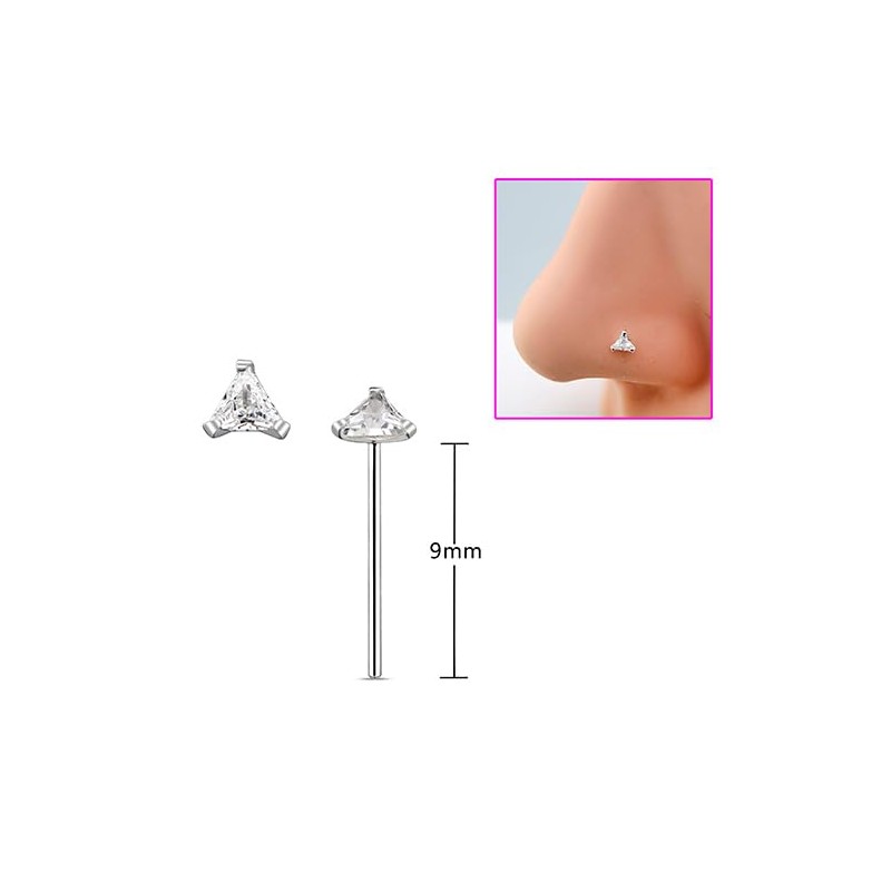 Size:3pcs Nose Studs Straight Stem Silver Sparkly Cubic Zirconia Triangle Stone 4mm Fine Bar 0.6mm Material: High quality 925 sterling silver and cubic zirconia stone with stunning shine. Color: It is waterproof, but avoid the use of chemicals. They are ideal for people who like to wear a triangle shaped sparkling crystal nose stud. Important tips: 1. Please check the dimensions before purchasing. The stone has a size of 4 mm and cannot fall off. Please do not lose it when you hang it on the towel or when you take off your clothes. 2. To put it in the nose, you need to bend the L-shaped rod and then dye it into the nostril. The rod is very easy to bend. Can be bent with your fingernails. 3. You will receive them well packaged in a gift bag.