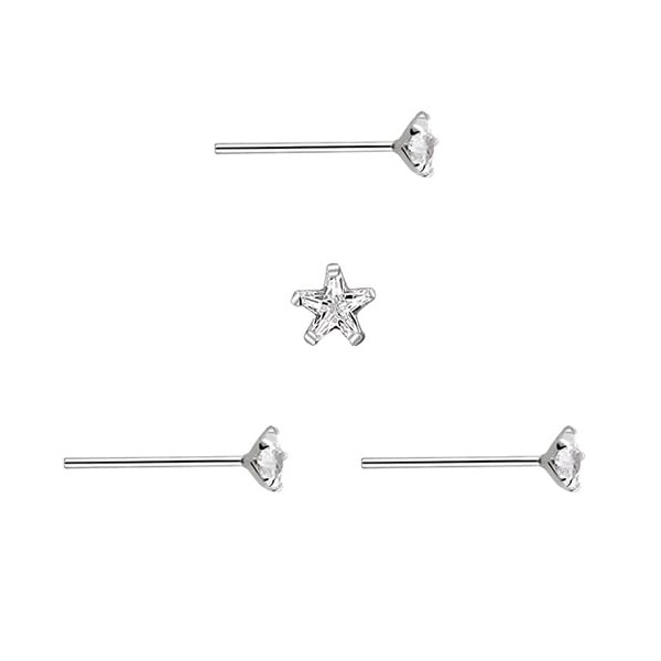 DENI 3 x Silver Straight Bar Nose Studs Sparkling CZ Star Shape 3mm Thin Bar 0.6mm Sterling Silver, Sterling Silver
