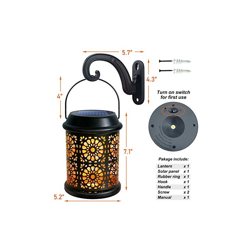 - 【Easy to Use】The lantern requires no wiring. Please make sure the solar panel expose to direct sunshine. First time using, make sure to turn on the switch, then it will automatically light on at night and light off in the day.These hanging solar lights are also ideal gifts for relatives, holidays, housewarming and gardening.