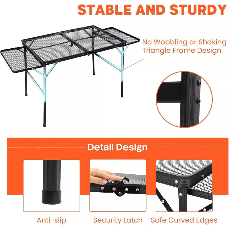 • 【Heat-Resistant and Waterproof Camping Table】 Our camping table has a premium aluminum alloy frame and sturdy iron mesh tabletop, offering great durability. The unique material mix is waterproof, fireproof, heat-resistant, and rust-proof, providing excellent protection. You can place it near water or use it with high-temp gear like grills, stoves, etc. It keeps performing well, even in flames, water, or humidity, without rusting. Cleaning is a breeze; a simple rinse makes it look new. It's a portable grill table for outdoor adventures, combining strength and versatility for reliable cooking