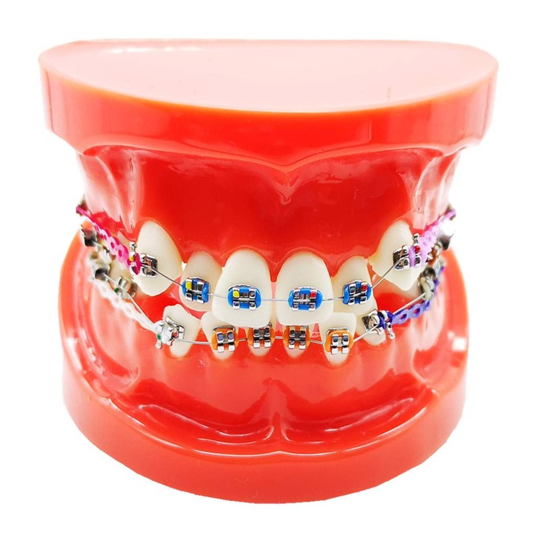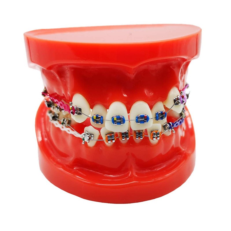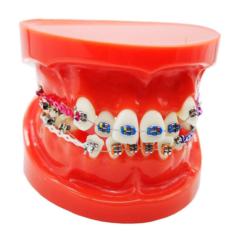 Dental Typodont With Metal Brackets Orthodontic Teeth Model With Ligature Ties Red