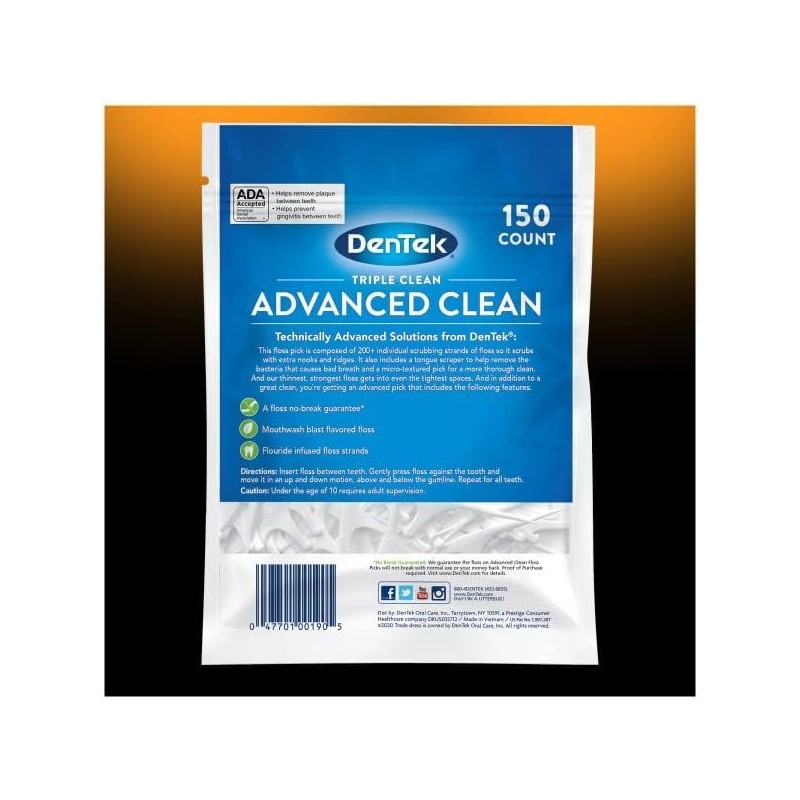 DenTek Triple Clean Advanced Clean Floss Picks have our thinnest, strongest floss that won't break or shred. The floss on DenTek Triple Clean Advanced Clean Floss Picks is composed of over 200 individual cleaning strands. The micro-textured pick helps to scrape away stubborn bits of food and plaque, and the tongue cleaner helps to fight bad breath. DenTek Triple Clean Advanced Clean Floss Picks feature Mouthwash blast flavored floss with fluoride-infused floss strands. While your teeth may feel clean after using a toothbrush and toothpaste, they're not fully clean without cleaning the spaces between teeth where food and plaque tend to remain. Use DenTek Triple Clean Advanced Clean Floss Picks to remove plaque and bits of food that often stay stuck between your teeth. Help prevent tooth decay and tooth stains by flossing after every meal.
