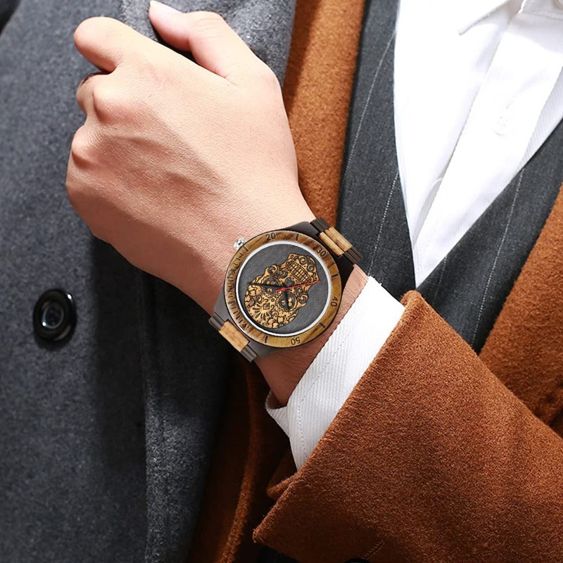 Dentily Men's Wood Watches Handmade Woooden Analog Quartz Skull Face Pattern ...