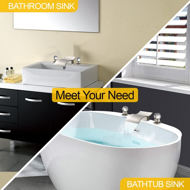 - 【Unique & Elegant Design】The brushed nickel bathroom faucet with two crystal handles and wide mount waterfall spout are in line with modern design aesthetic which highly enhance the class of your bathroom. The wide waterfall spout delivers a gentle sheet of laminar water and provides you the most comfortable washing experience. Crystal handle is the ornament that elevates the class of your bathroom.