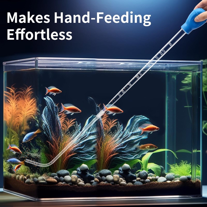 - 🐠Practical Size - This 17.7-inch (45 cm) fish food feeder features a 9.8-inch (25 cm) L-shaped, 80-degree extension tube, offering a total reach of 27.5 inches (70 cm). It easily reaches deep, hard-to-access spots in your aquarium. To get stronger suction, we thickened and enlarged the top (approx 2-inch / 5 cm diameter).