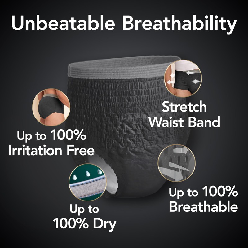 - Discreet, Secure Fit: Stretch waistband for secure fit with tailored leg elastics to help prevent bladder leaks.