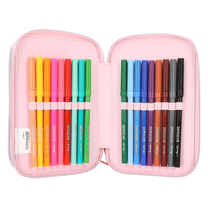 Depesche 12262 TOPModel Happy Together Filled 3-Compartment Pencil Case with Model Motif and Smiley Pattern, Pencil Case with Colouring Pencils, Scissors, Ruler and much more, Multi-Coloured, pink,