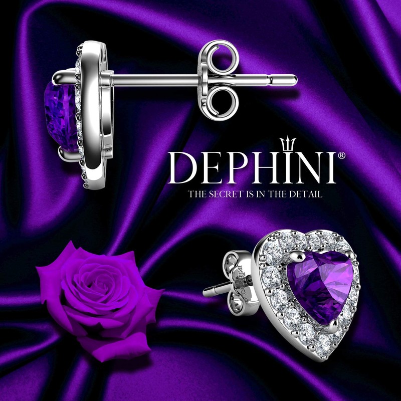 DEPHINI - Purple Heart Earrings 925 Sterling Silver CZ Crystal Pendant Fine Jewellery Stud Earrings - Rhodium Plated - Cubic Zirconia
