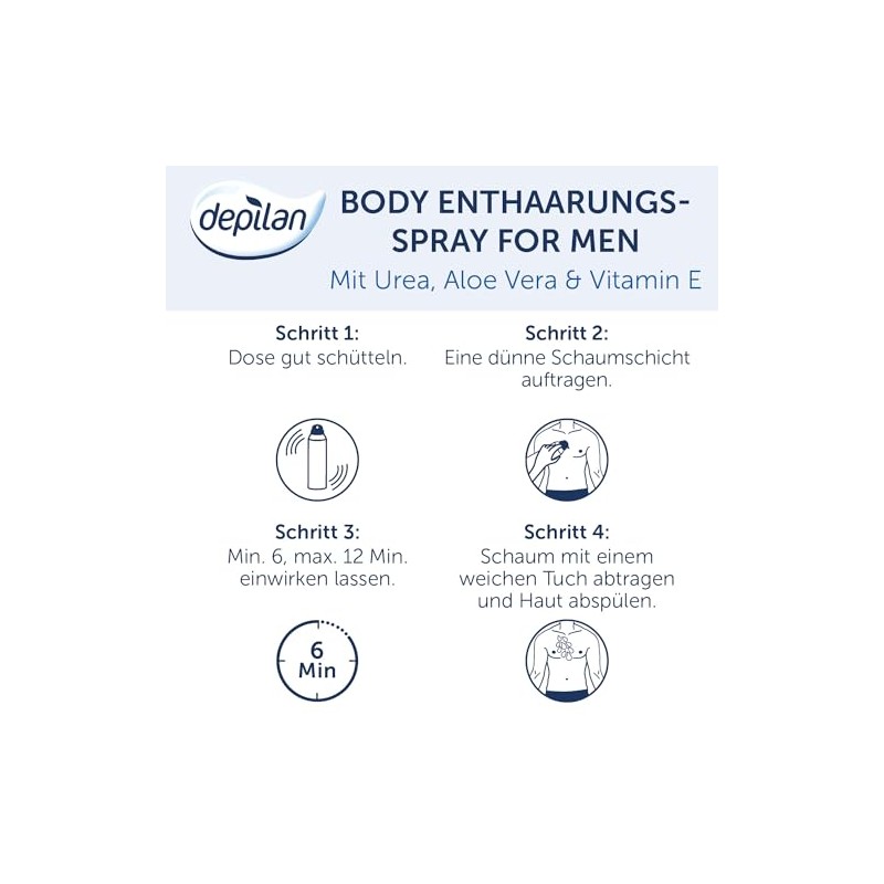 Einfach aufsprühen – einwirken lassen – und abwaschen Der Depilan for men Enthaarungsspray wurde speziell zur sanften und effektiven Entfernung von männlichen Körperhaaren entwickelt. Der Spray ist für die Anwendung an Brust, Rücken, Armen, Beinen, und Achseln geeignet. Stoppelfreie Männerbrust Depilan for Men Enthaarungsspray revolutioniert das Enthaaren und macht es super schnell und einfach. Das praktische Spray ist für die Anwendung an Brust, Rücken, Armen, Beinen und Achseln geeignet und macht die Anwendung noch leichter: Einfach aufsprühen – einwirken lassen – und abspülen. Glatte Haut ganz ohne Schnittgefahr. Wichtige Hinweise Es empfiehlt sich vor der ersten Anwendung einen Empfindlichkeitstest durchzuführen. Anwendung Lesen Sie zuerst die wichtigen Hinweise! Wenden Sie den Spray in der Dusche oder Badewanne an. Die Dose sollte nicht geschüttelt werden. Die zu entfernenden Haare sollten 3–8 mm lang sein. Sprühen Sie den Spray aus ca. 5–10 cm Abstand auf die trockene oder leicht feuchte Haut auf. Achten Sie darauf, dass alle zu enthaarenden Stellen vollständig bedeckt sind. Dickes Auftragen ist dabei nicht notwendig. Beim Enthaaren der Brust, sparen Sie bitte die Brustwarzen aus. Lassen Sie den Schaum 4–5 Minuten einwirken und versuchen Sie ob sich die Haare bereits mit dem Schwamm entfernen lassen. Die Einwirkzeit ist abhängig von der Haarstärke und -beschaffenheit. Sollten sich die Haare nicht ablösen lassen, lassen Sie die Masse noch weitere 2–3 Minuten einwirken. Die maximale Einwirkzeit beträgt jedoch 8 Minuten. Nach der Haarentfernung die Haut gründlich mit Wasser abspülen. Für die Enthaarung im Achselbereich, bitte eine kleine Menge in die Handfläche sprühen und gleichmäßig verteilen. Danach die Hände sofort abspülen. Es ist empfehlenswert nach der Anwendung eine beruhigende, alkoholfreie Creme zu verwenden. Über depilan Jahrelange Erfahrung im Bereich Haarentfernung machen die österreichische Marke depilan zum Experten. Konsumenten müssen sich auf die Leistung der Enthaarungsprodukte verlassen können. Wir fokussieren uns daher bei den depilan Produkten weiterhin auf die Kern-Bedürfnisse beim Enthaaren: Einfaches Auftragen, lang anhaltende Ergebnisse und ein angenehmer Duft bei der Anwendung. Alle depilan Produkte werden sorgfältig getestet um höchste Wirksamkeit und Hautverträglichkeit sicherzustellen. Wirksamkeit bei depilan Produkten ist sehr wichtig und wird auch regelmäßig von uns überprüft. Die stoppelfreie Haarentfernung oder das Aufhellen von lästigen Haaren soll problemlos und wirksam für unsere Konsumenten sein. Alle depilan Enthaarungscremen sind vegan und enthalten pflanzliche oder synthetische Inhaltsstoffe.
