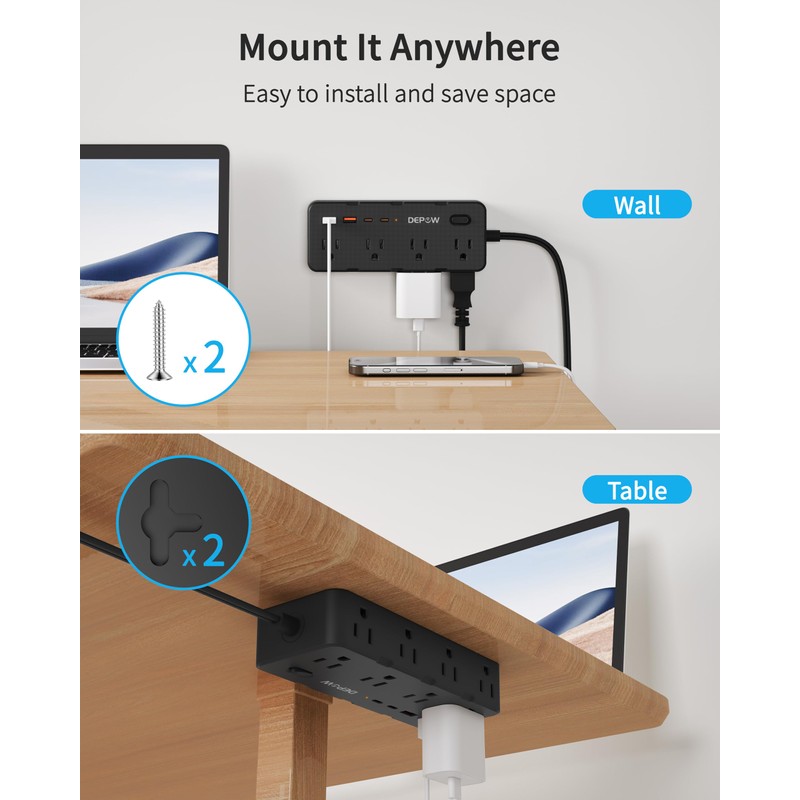 DEPOW Black 2 Prong Power Strip, 2 to 3 Prong Outlet Adapter with 8 AC & 4 USB Ports (2 USB C),6 FT Extension Cord