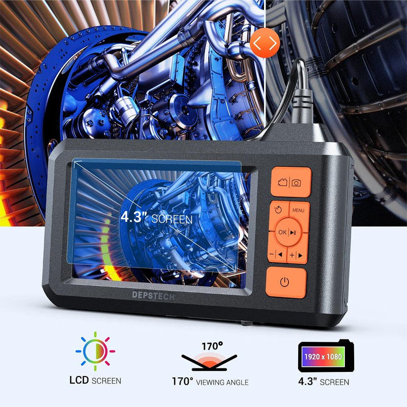 - Color Screen and Crisp 1080P: Upgraded wide-angle 4.3-inch TFT LCD screen provides a horizontal viewing angle of about 170. The endoscope camera captures 2.0 MP crisp pictures and 1080P HD fluent videos. The adjustable 7 LED lights with Bluart 2.0 tech provide you with a clearer view on each inspection. The built-in battery can work continuously for about 4 hours and is easily rechargeable through a USB cable.